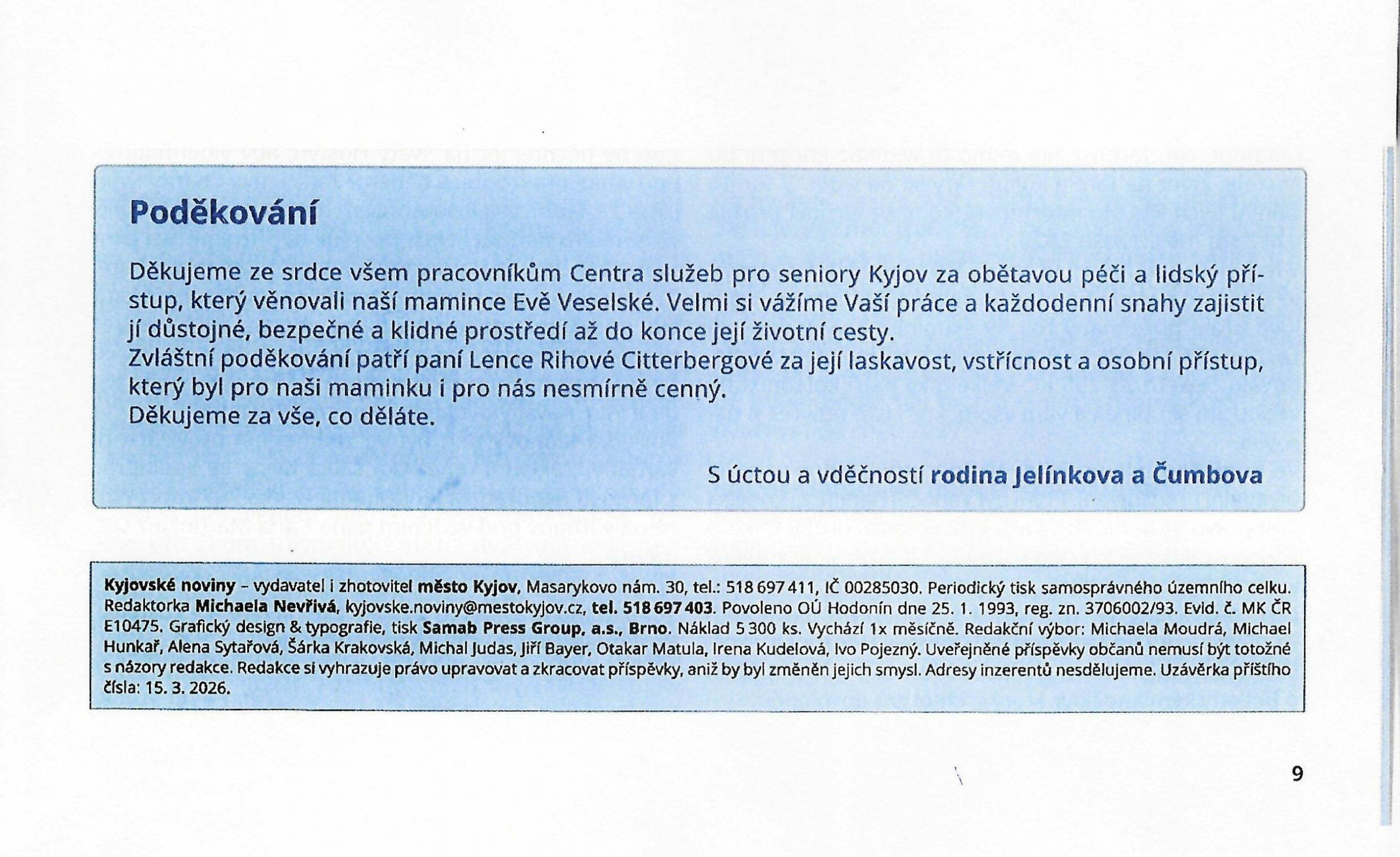 dovolte mi, abych Vám jménem naší rodiny vyjádřila upřímné poděkování za péči, kterou pracovnice Centra služeb pro seniory věnovaly mé mamince v posledních dnech jejího života.